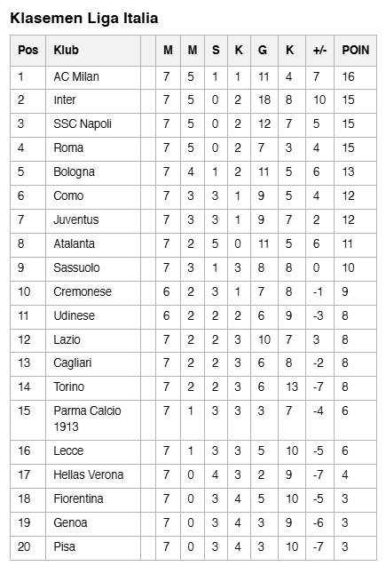 Sementara itu, di laga lain, AC Milan memastikan posisi puncak setelah menundukkan Fiorentina dengan skor 2-1 di San Siro. Tambahan tiga poin membuat Rossoneri kini memimpin klasemen dengan 16 poin.