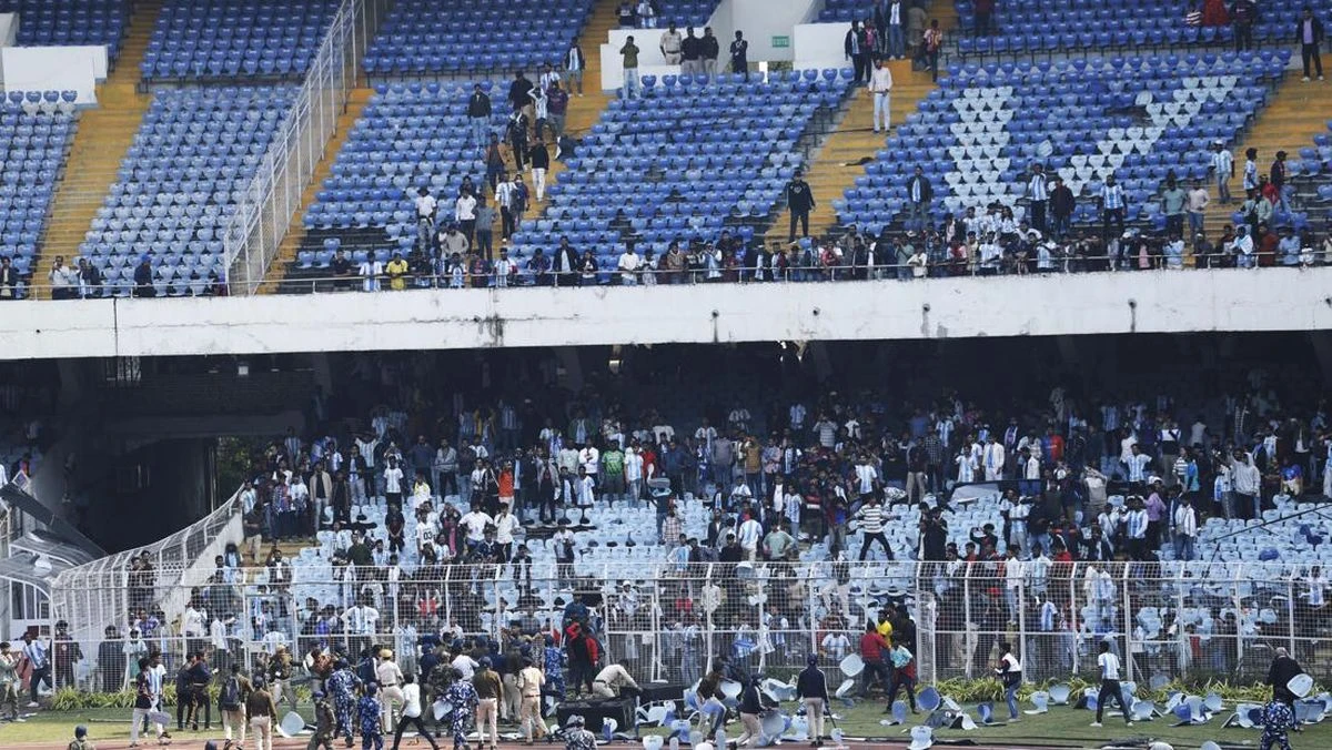 Lionel Messi mengunjungi Kolkata pada rangkaian 'GOAT [Greatest Of All Time] Tour di India, Sabtu (13/12). Situasi keos terjadi.